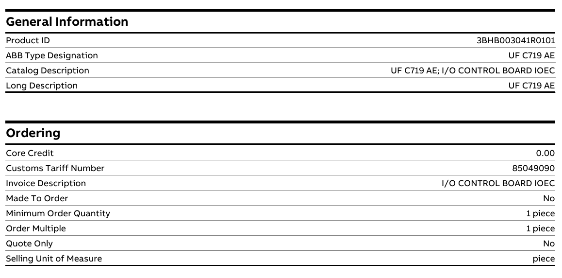 ABB 3BHB003041R0101 UFC719AE è una scheda di controllo I/O dedicata progettata e prodotta da ABB per i suoi sistemi di automazione e azionamento industriale. Secondo la tabella dati fornita, questa scheda non è un dispositivo I/O modulare indipendente che può essere utilizzato direttamente in loco, ma è integrata come componente funzionale principale in un kit più complesso.