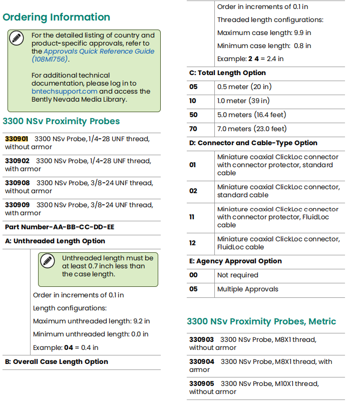 Bently Nevada 330901-00-90-05-02-00 può essere utilizzato con il cavo di prolunga 3300 NSv specificato e il sensore di prossimità 3300 XL NSv per formare un sistema di misurazione completo e perfettamente funzionante.