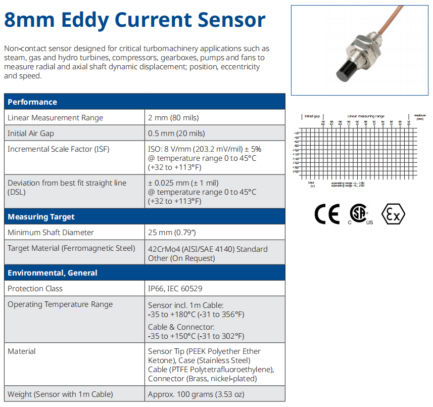 PR6423/013-130 è in grado di catturare le vibrazioni radiali o assiali dell'albero a livello micrometrico in tempo reale, con un intervallo di risposta in frequenza generalmente compreso tra 0 e 10 kHz, sufficiente a coprire le frequenze caratteristiche della maggior parte dei guasti delle macchine rotanti. Posizione statica