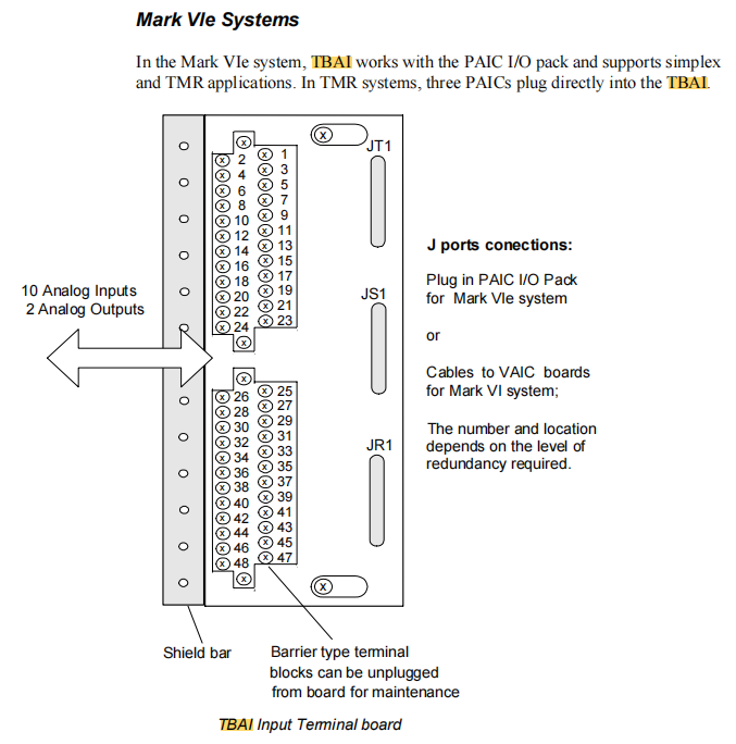 Supporto per operazioni di hot-swap Nei sistemi Mark VIe configurati con moduli VAIC ridondanti, se è necessario sostituire la morsettiera TBAI stessa, è possibile scollegarla dal cavo intrecciato e sostituirla mentre il sistema è in funzione, ottenendo una manutenzione "zero downtime" reale, seguendo rigorose procedure di sicurezza.