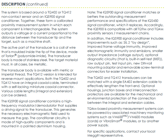 Marca: VibrometroDescrizione:Trasduttore di prossimitàCondizione: NuovoGaranzia: 1 annoQuantità inventario: 1Termine di pagamento: T/TPorto di spedizione: XiamenTQ412 111-412-000-012-A1-B1-E010-F0-G000-H05 è un modulo di monitoraggio delle vibrazioni industriali prodotto da Vibro-Meter, utilizzato principalmente per la protezione dalle vibrazioni e il monitoraggio di macchinari rotanti.