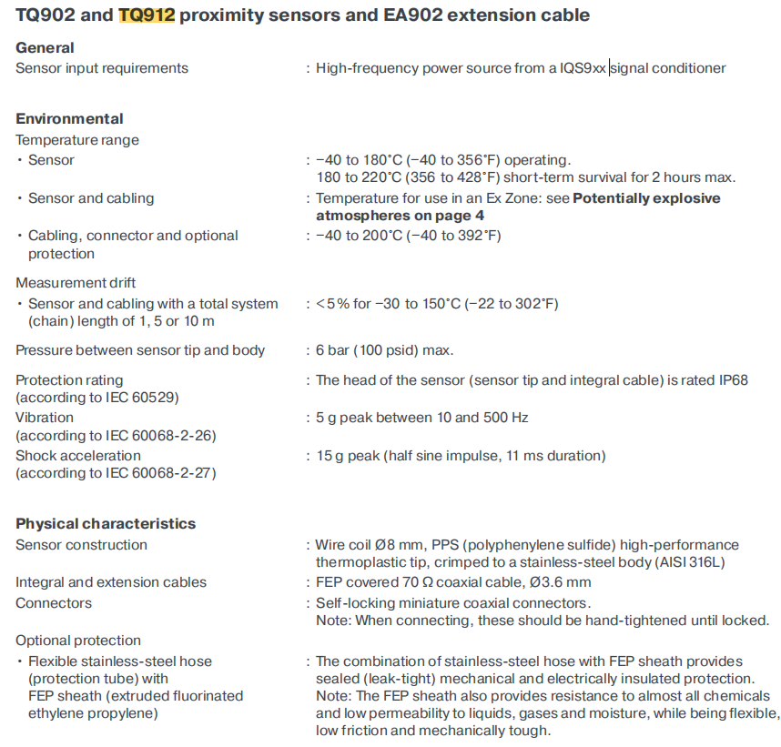 Il TQ912 è un sensore di prossimità senza contatto ad alte prestazioni della linea di prodotti Vibra-Meter ® di Parker Meggitt, progettato specificamente per applicazioni a montaggio inverso. Funziona in base al principio delle correnti parassite e viene utilizzato per misurare con precisione lo spostamento relativo tra la sonda del sensore e il bersaglio metallico. Questo sensore viene solitamente utilizzato in combinazione con il cavo di prolunga EA902 e il condizionatore di segnale IQS900 per formare una catena di misurazione di prossimità completa e calibrata.