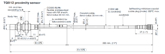 TQ912 111-912-000-01X-A1-B1-E5000-F0-G0-H05 Il sensore di prossimità ha una parte attiva che è una bobina di filo che è modellata all'interno della punta del dispositivo, realizzato in PPS (polifenilene solfuro), un termoplastico ingegneristica ad alta temperatura. Il corpo del sensore è realizzato in acciaio inossidabile. In tutti i casi, il materiale target deve essere metallico.